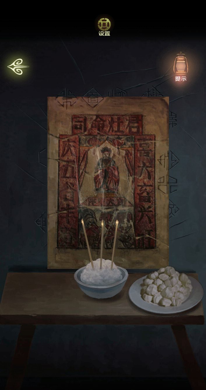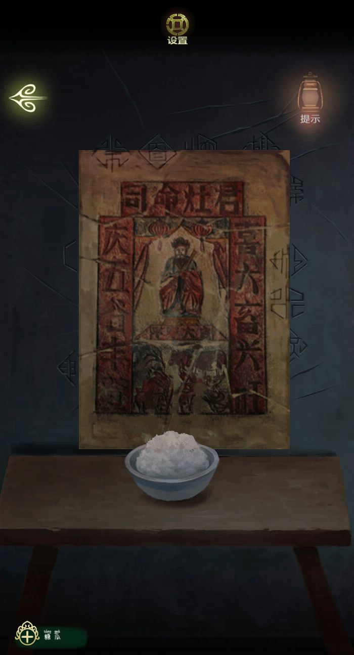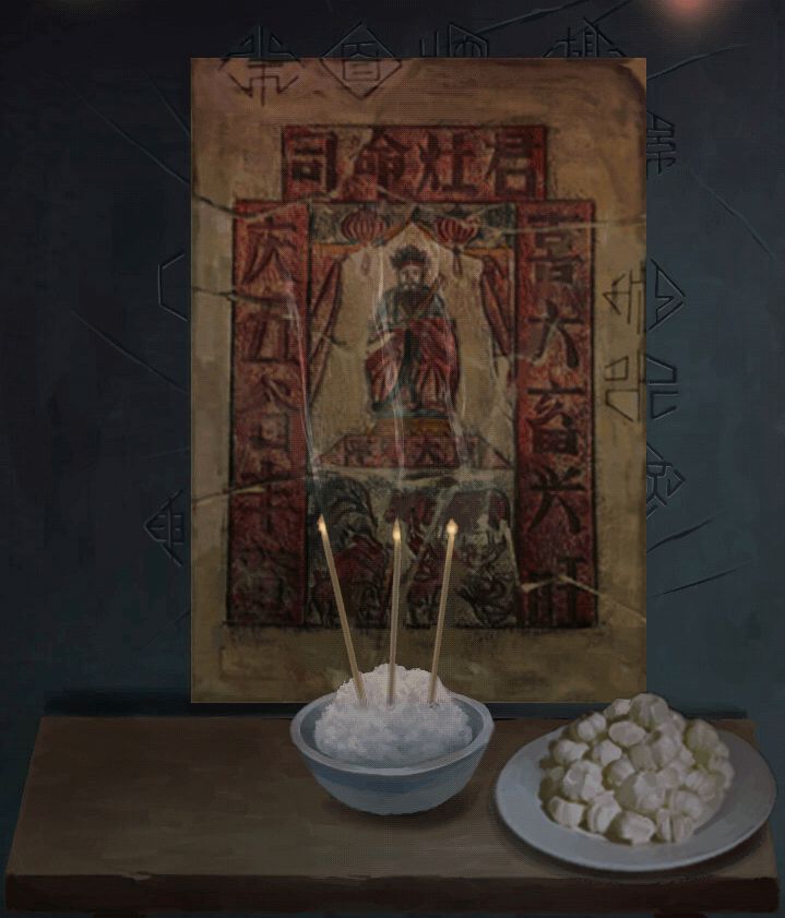 先点浆糊,再桌上的灶君像碎片