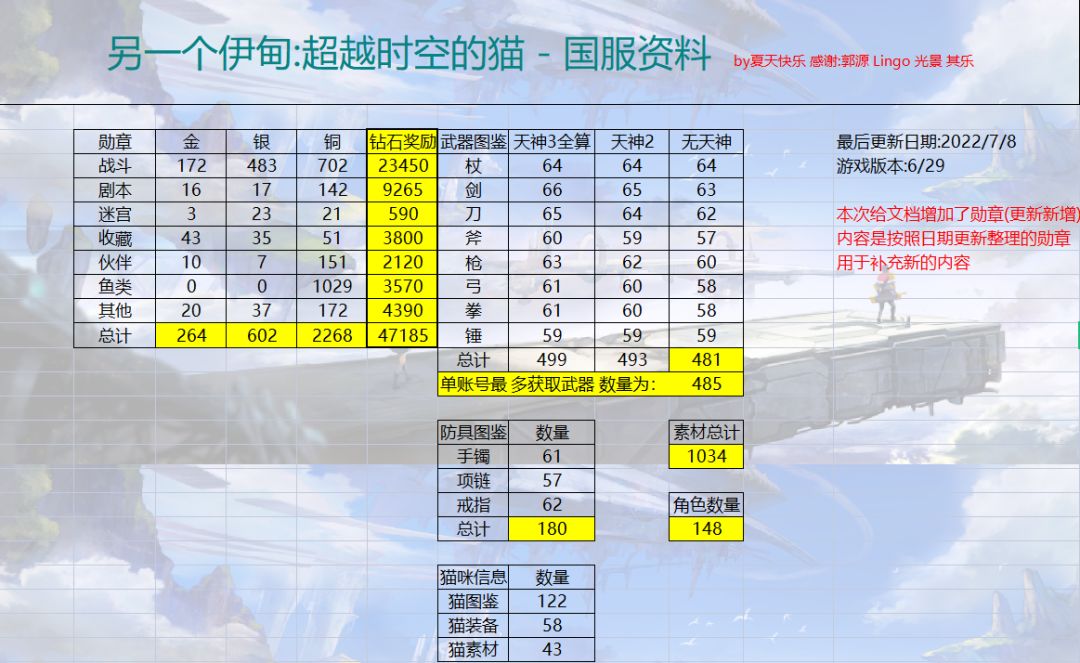 针对各处相关内容进行细分化,统计了全勋章/武器图鉴/防具图鉴/猫咪信息/素材图鉴/角色数量