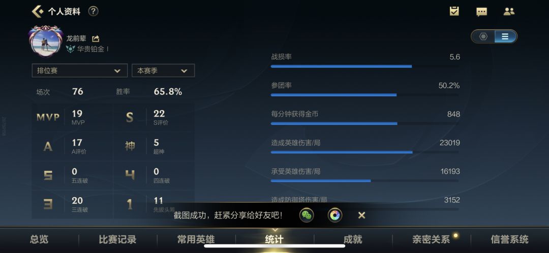 但是问题来了,他作为打野主位置,排位胜率70%,kda只有2.9,我自己kda5.6,而且其中后面20几盘,全都是5排上的分。胜率65%,和他段位一样。