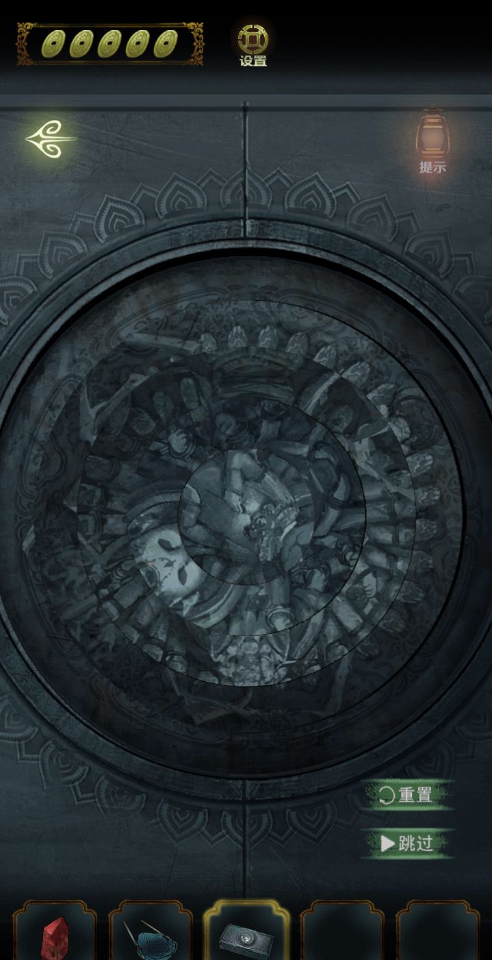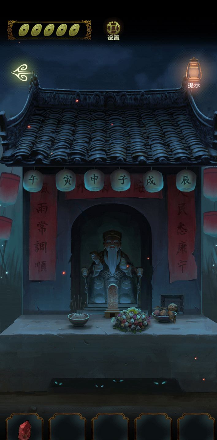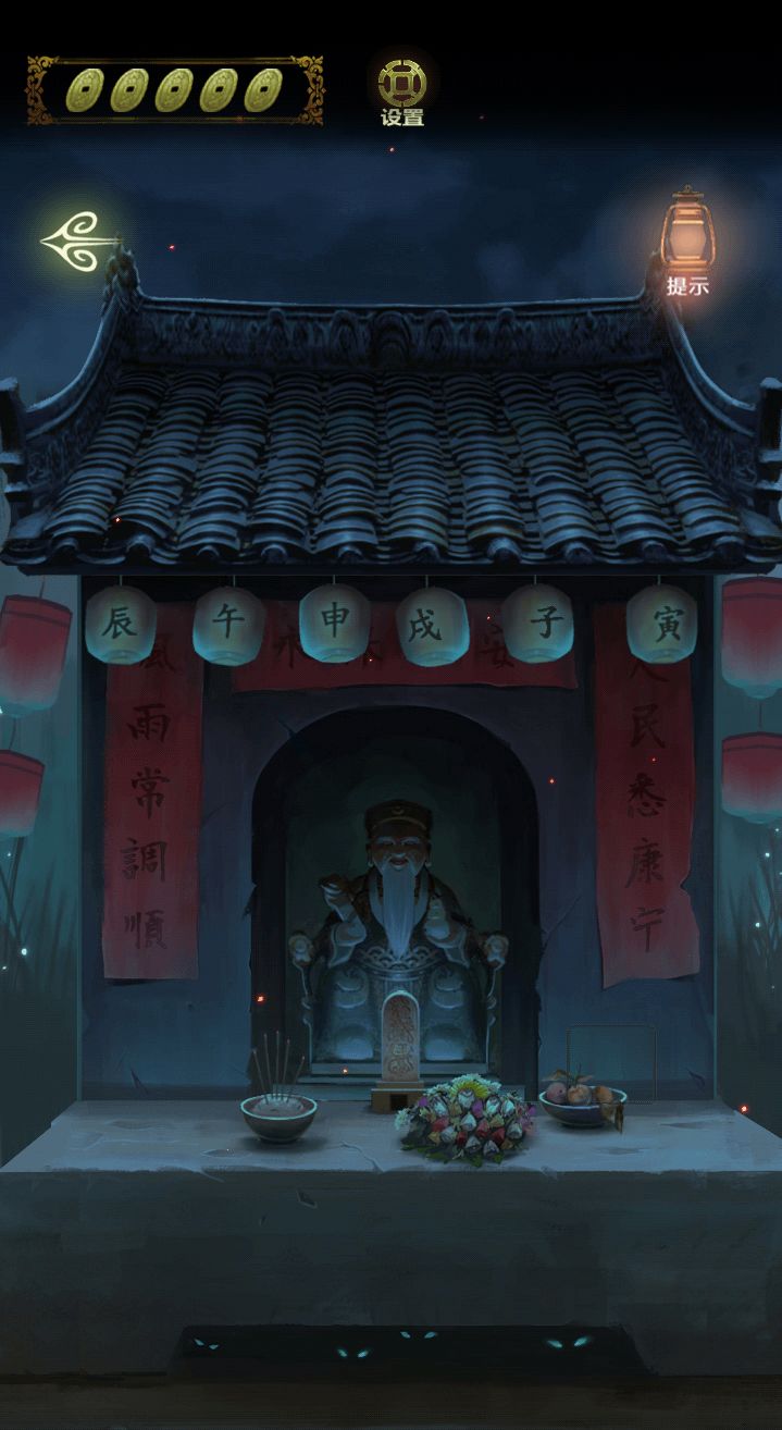 会看见土地爷石像右下角有个暗格,石像前的灯笼没有亮。要求我们按照正确顺序点亮灯笼,触发开关。
