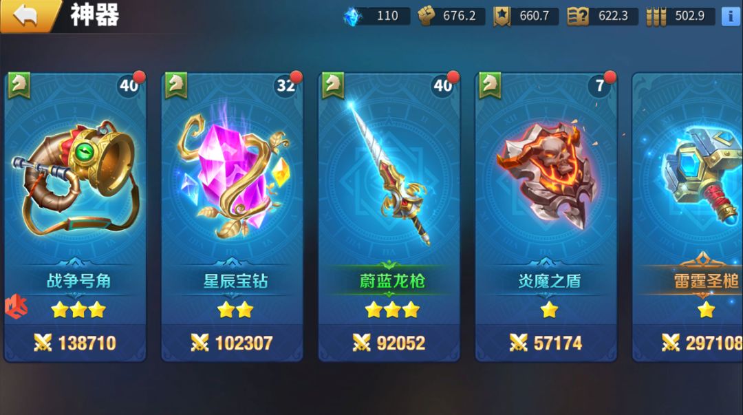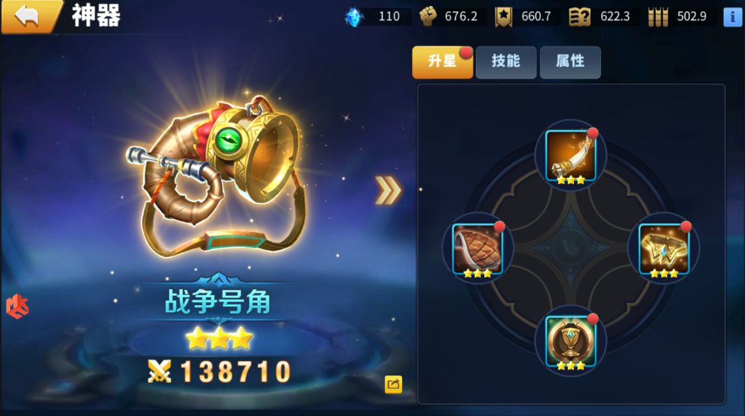 再给大家说一说神器的提升方式,神器的提升方式有两种:神器升星和技能提升。神器升星需把所有举出部件升到同等星级,才能进行升星(神器的基础部件可通过副本、战斗和抽奖获得),基础部件和神器的升星都可以提高神器的属性。技能提升需消耗指定道具,每提升10级需消耗其他指定道具,技能提升能提高技能的效果。