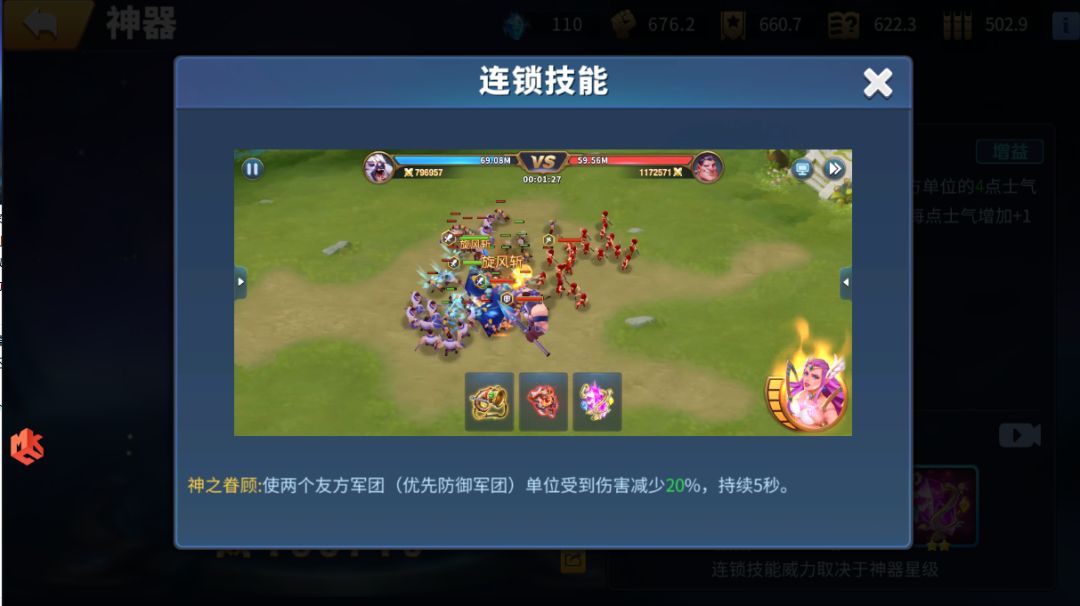 其实神器还有一个组合技能,这个技能不会在神器界面中直接展示,需要上阵战场后才会生效,组合技能的效果还会随着组合的神器星级提升而提升。(只有部分神器拥有组合技能)
