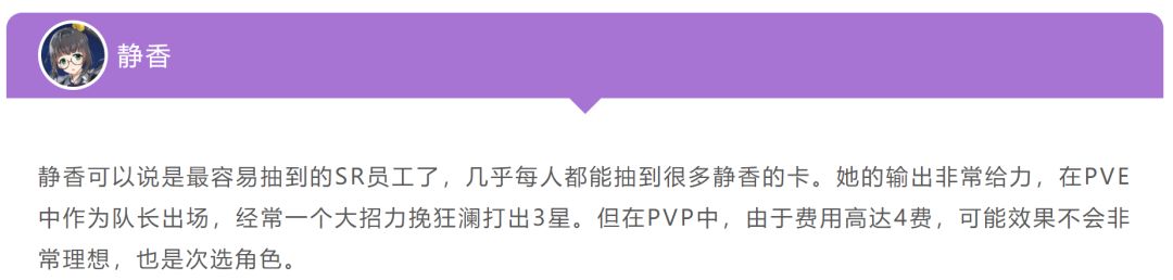 由于内测的时候嘉恩并没有出场,所以暂时先推荐这三个自动PVP很强的SSR员工,目前公测中可以雇佣到了嘉恩,那嘉恩是曜灵首推的主C,3费的角色却比肩4费的输出量,而且特殊技团控、被动减攻速,CD还快。