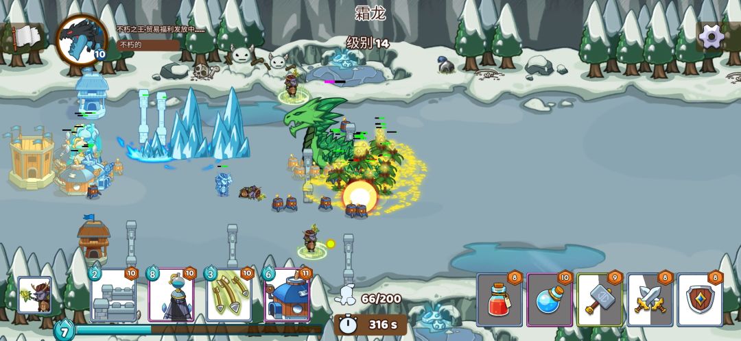 如果有夜精灵和法力瓶道具或者火焰爆炸法术,打起来会更加轻松,接下来说说打法,首先进去霜龙那里先在家门口建筑前放工坊,多放点,同时给他不断的法术问候,箭雨,地雷,火焰爆炸,或者更多,注意,最少要携带三个法术清理他小弟,不然容易翻车。然后等他走到我的地盘,把他四面围堵起来开始打他,记得,一定要多放地震,地雷和芬奇,不然很容易被他把你打翻。地震要等他眩晕结束了才继续放眩晕中再放地震只扣血,不会增加眩晕时间。然后就慢慢的磨死他,如下图。