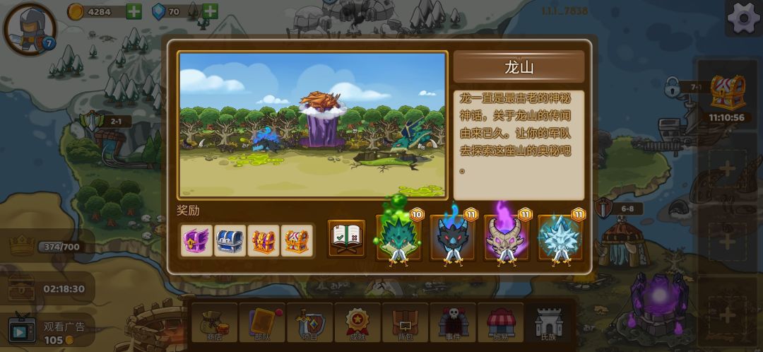 龙山,打到第二章就会开启1级毒龙,打到第三章开启2级炎龙,打到第四章开启3级亡灵龙,打到第五章开启4级霜龙,龙山的四条龙每打赢一次升一级,投降或者打输了不会降级,龙等级上限和人物等级有关,7级的是12级龙,8级之后龙的等级上限是人物等级+4,每天每条龙可以打一次,每天八点刷新挑战次数,挑战龙山的龙赢了随机奖励巨型宝箱(金币很多),史诗宝箱,魔法宝箱和传奇宝箱当中的一个,挑战龙的级别越高,出的箱子越好,挑战失败的话不会有任何惩罚。