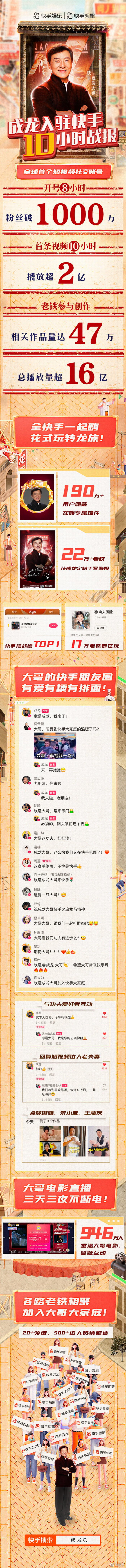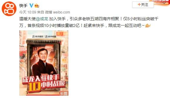 今天(10月28日)快手官方微博公布了成龙入驻快手10小时战报。开号8小时粉丝突破1000万,首条视频10小时播放量超过了2亿,老铁参与创作相关作品量达到了47万,总播放量超过了16亿。