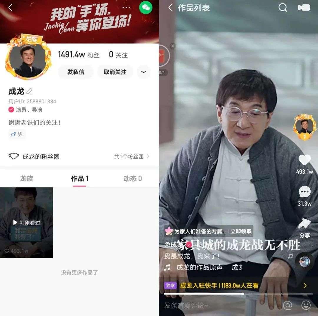 又有国民巨星入驻短视频平台,近日快手官方微博宣布巨星成龙入驻快手。这位明星入驻快手后引发网友强烈反响,播放量、粉丝数迅速暴涨。