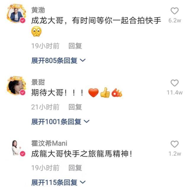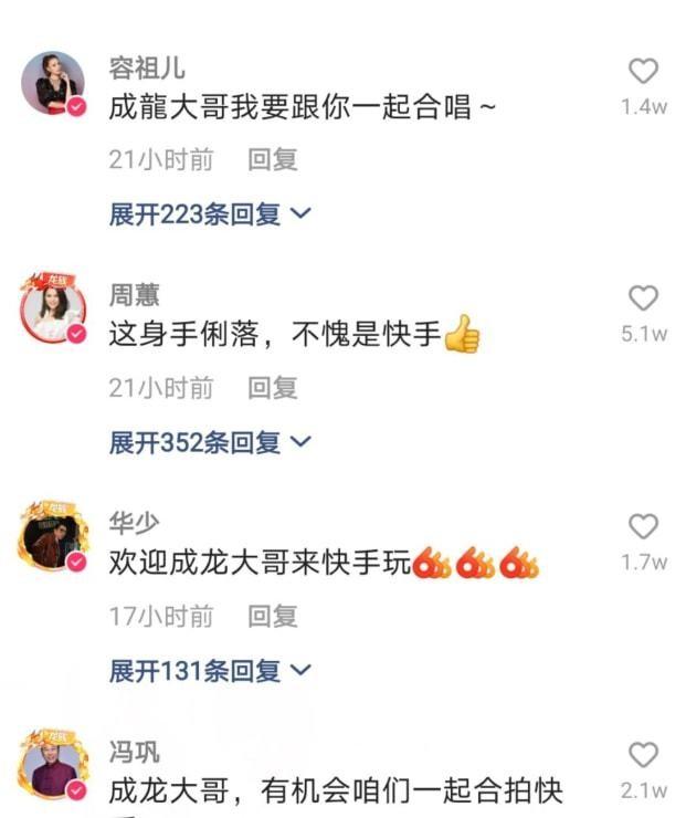 在成龙短视频作品的评论区里,聚集了大量明星,有黄渤、景甜、曾志伟、容祖儿、冯巩、钟欣潼、蔡卓妍等。平日里,我们只看到普通人追这些明星,很少看到他们成为别人的迷弟迷妹。从这个角度来看,成龙大哥确实太牛了。