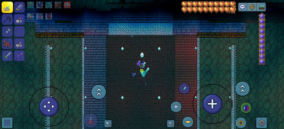 造了一个含复数生物群落的洞穴刷怪场,包含雪地,丛林,腐化,猩红,神圣,蘑菇,地牢七种生态。出生点上方传送机即到刷怪场。刷怪区域铺上了背景墙便于区分,神圣背景墙没铺是为了刷混沌精,底层鱼池可以钓鱼,这一层是安全区,有三个村民保证基本上不刷怪。启动右侧的计时器可以开启自动杀怪机关。也可以自己再倒一桶岩浆。
