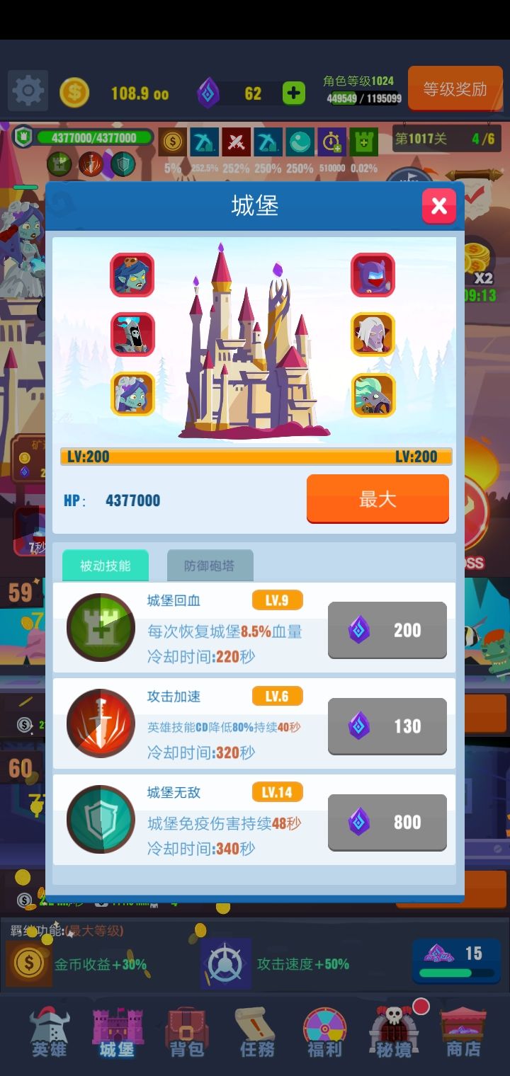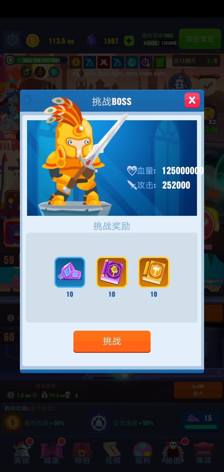 目前1600关。。。感觉是个无底洞。boss应该最高就这个了。不呢在高了。还好我城堡升了个50秒无敌。。等技能过