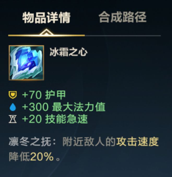 这件装备是英雄联盟手游里护甲第二高的防御装备,排在其前面的则是75点护甲的荆棘之甲。冰霜之心的降低攻速效果非常实用,可以降低敌方普攻型英雄的伤害能力。