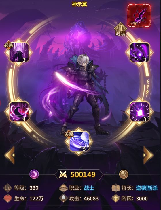 Lv3:当神示翼拥有10层杀意时,必杀对生命最低的敌方目标额外造成100%攻击力的真实伤害。造成真实伤害前如果目标生命低于20%,则直接【斩杀】目标(伤害为目标生命值的20%,不超过神示翼攻击力的1000%,无视目标护盾和防御)。