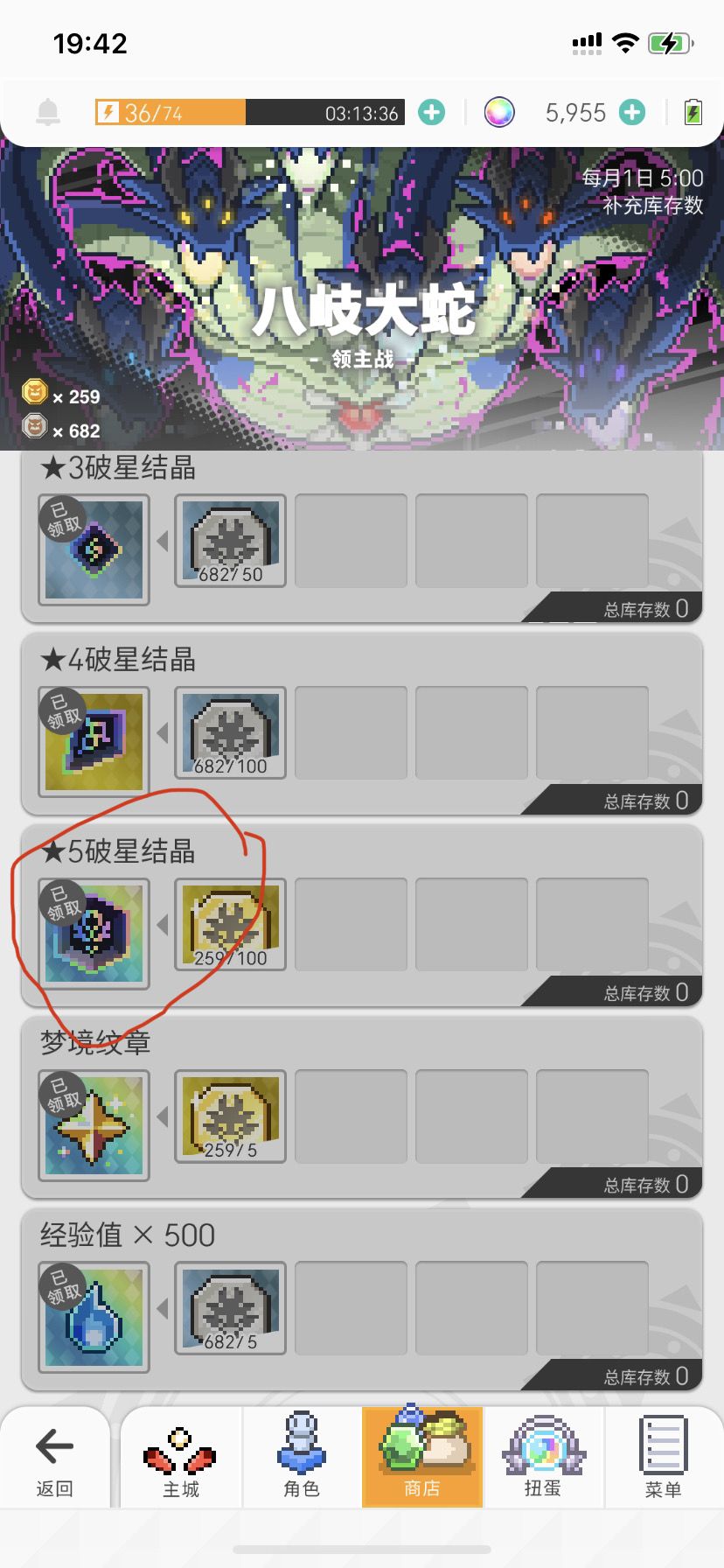 在不需求崩坏域武器和梦境文章的情况下也可以拿体力建房去和互关好友一起刷共斗大蛇(虽然我是更喜欢蝗好友的体力打就是了),建议优先去大蛇刷够币把那个卖100币的5星破星道具换了,这个每个月只有一个,很珍贵,也很保值