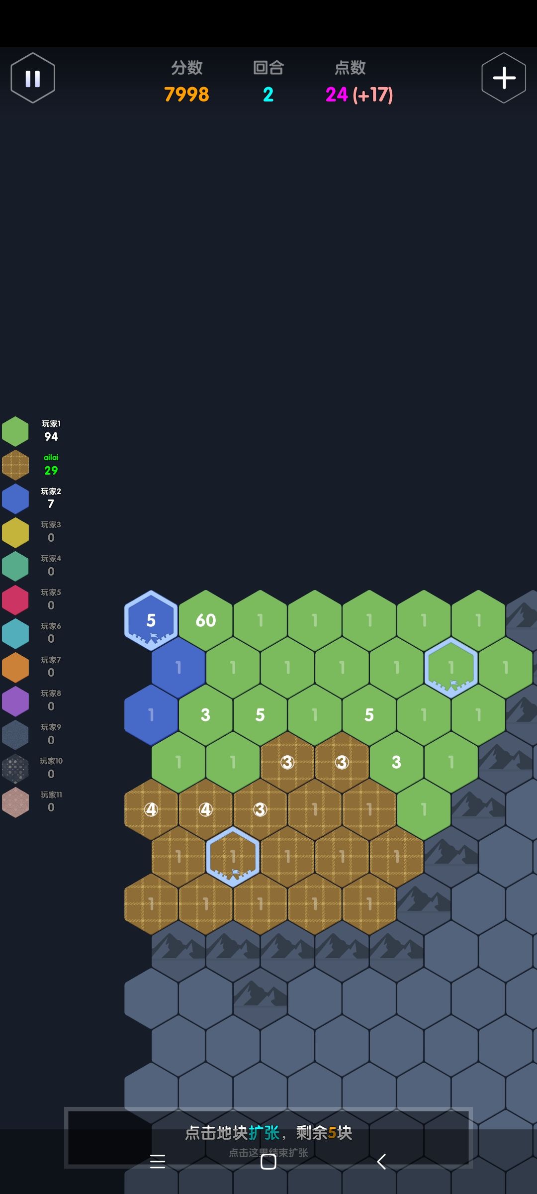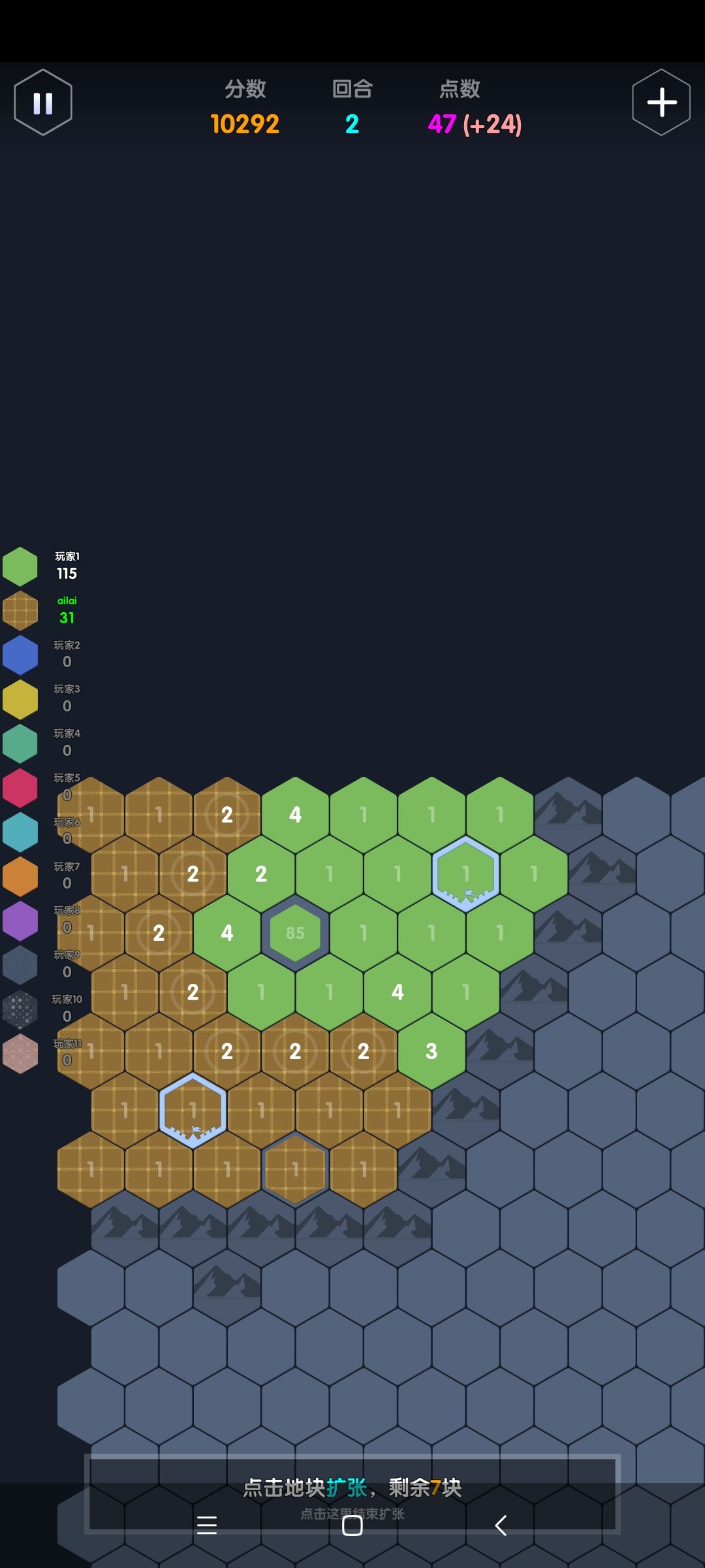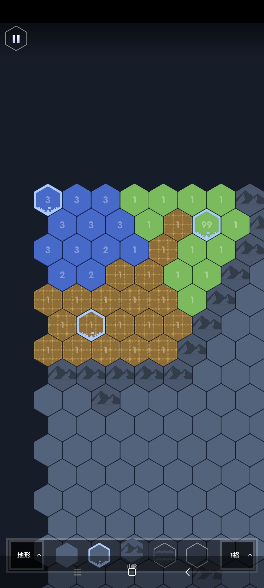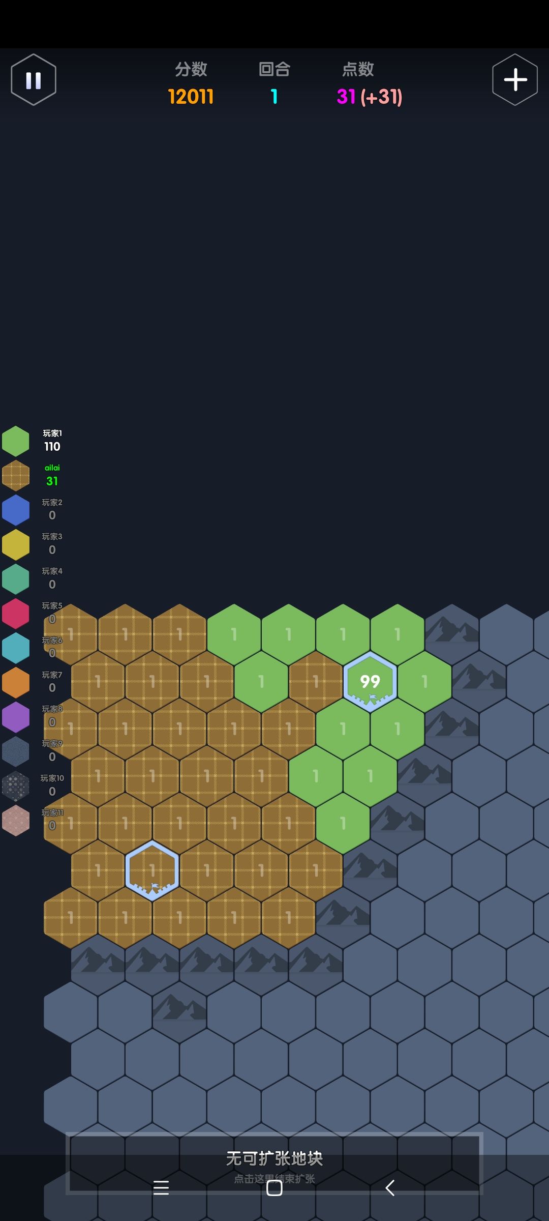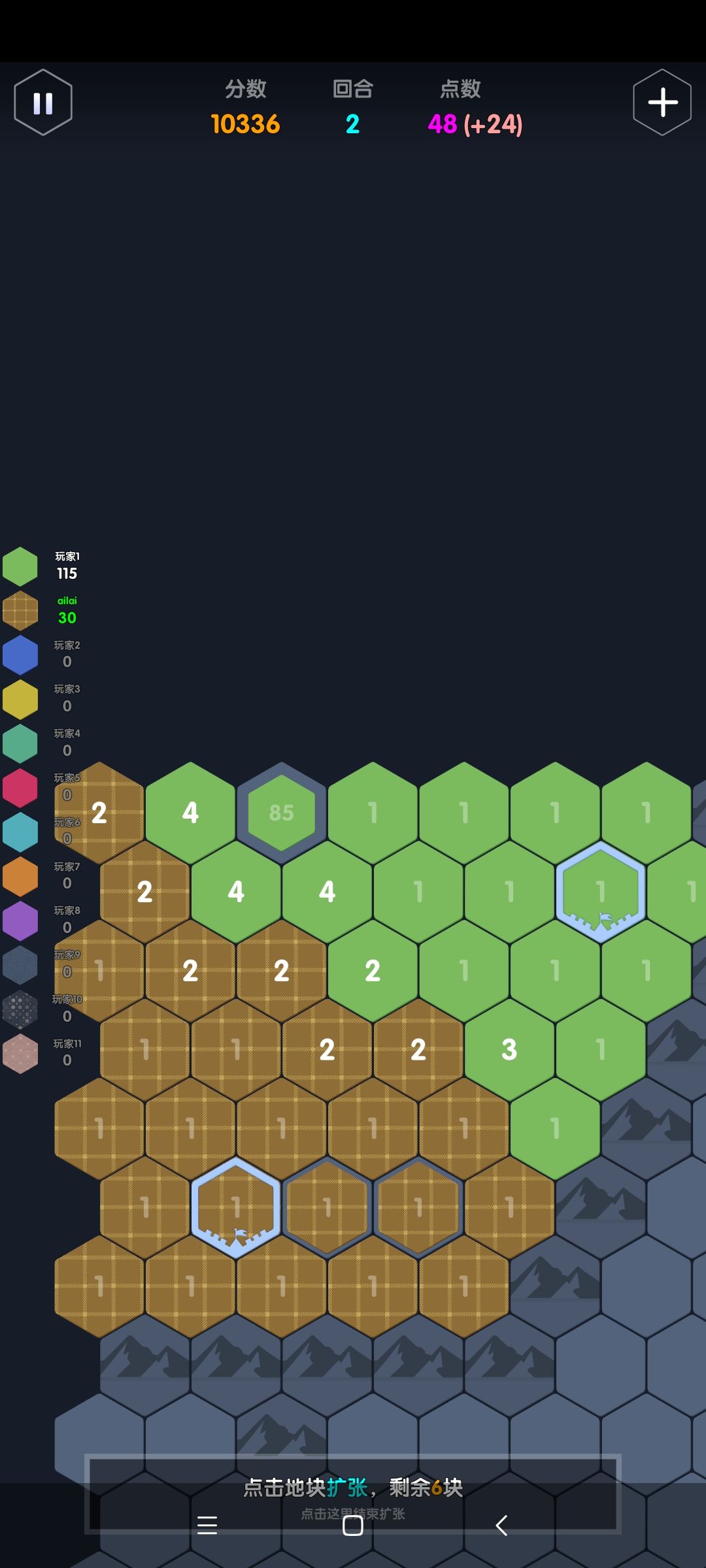 最重要的是,判断好拐点,保证大点数格子不会插入己方阵地。在图10,因为没有迷雾,可以判断绿色大点数会沿着己方的两个1,然后蓝色2的边境突进一直撞到左边界,此时绿色要突入蓝色阵地,遇到的阻力都是3,因此我们要在己方的防守点加到4及以上如图11,保证绿色会冲进蓝色阵地而非我方