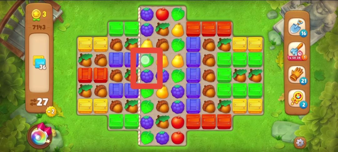 ①观察开局:彩色箱子分布在两边,并且有橡实围绕在旁边,紫色箱子和最左边的红色需要两次才能清除,我的策略是至少在紫色箱子旁边匹配一次,这样凑到双彩就可以一下收集完所有目标!仔细观察开局有送一个炸/弹如下图交换树叶和葡萄,再走一步就可以得到炸/弹