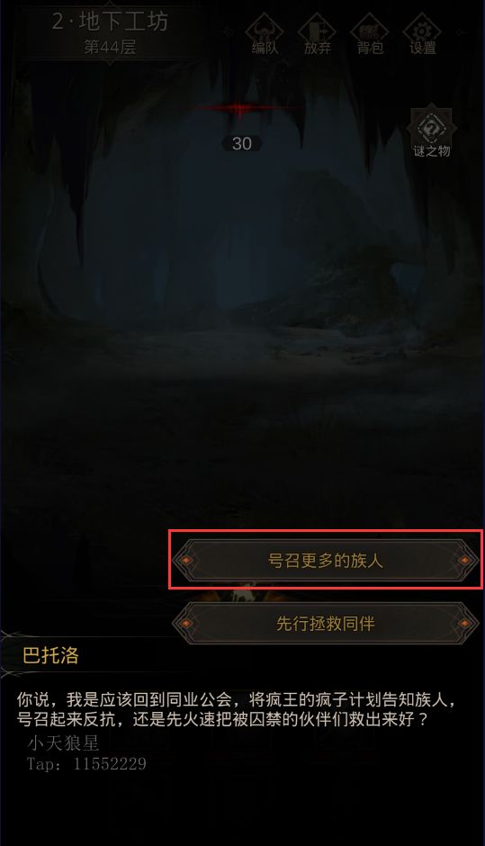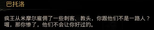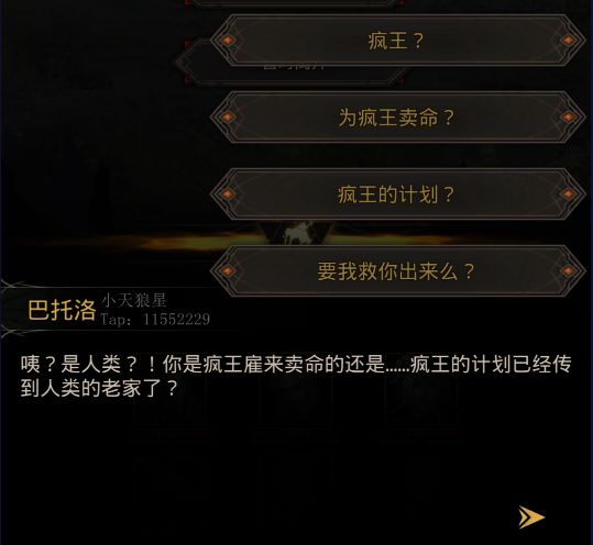 给予水后,【巴托洛】说,你们是不是【疯王】雇来的? 当然不是,你们可是招魂师呢!还问了你们是否知道疯王的计划,以及为什么建造这个洞穴: