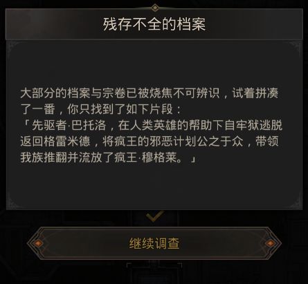 【巴托洛】问你的建议是先解救同伴还是先回去召集人,你们看了看远处巨魔的尸体,在看了看眼前的巴托洛】说道:“那还是先去召集同伴吧”
