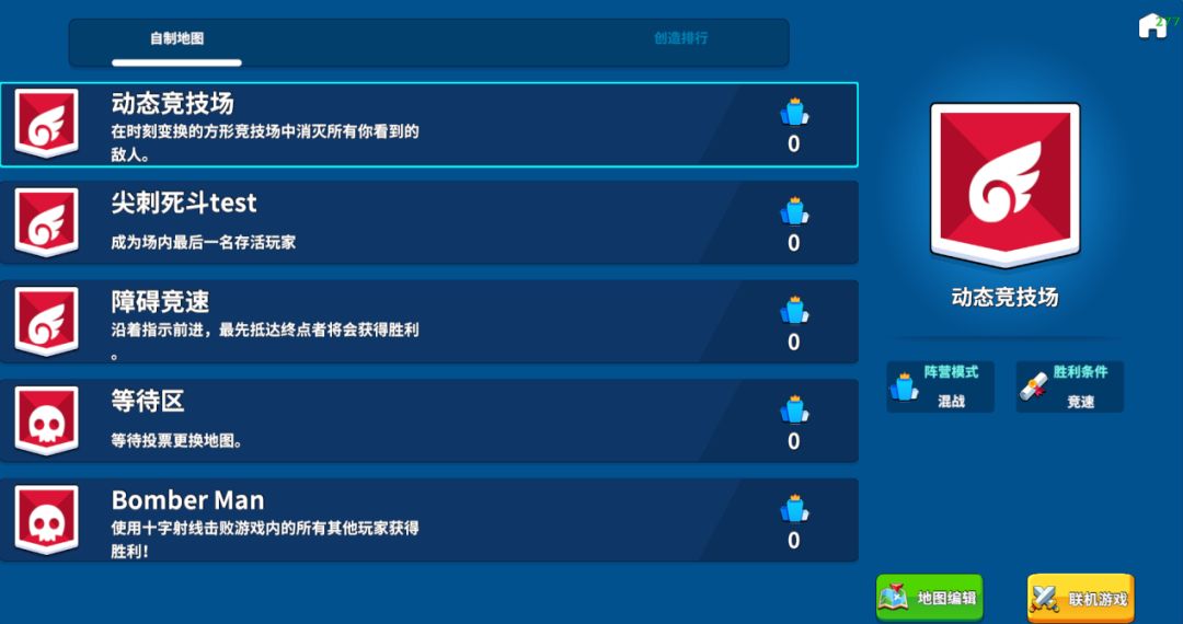 (2)单机测试同上,允许玩家在只有自身1人的匹配环境下测试地图的功能。