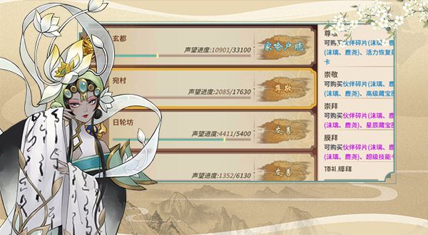 讲到伙伴系统还有一个不得不提的便是声望系统,在游戏中不同地域的声望度将会影响到在当地声望商店可购买的物品种类与数量,为什么说与伙伴系统息息相关呢,就是因为我们伙伴晋升必备的碎片、以及觉醒所需的觉醒石都是要在声望商店里购买的,结合前面所说重点培养的伙伴,建议大家在获取到自选声望卡的时候,可以优先去提高宛村(达到“中立”可购买伙伴沫璃、鹿尧觉醒石)、玄都(达到“一鸣惊人”可购买伙伴姜子牙觉醒石)以及日轮坊的声望度(达到“中立”可购买伙伴凰觉醒石),那么声望卡如何获得呢?这又回到了我们最开始的起点啦~多在大地图上逛逛你就知道好处了哈哈~