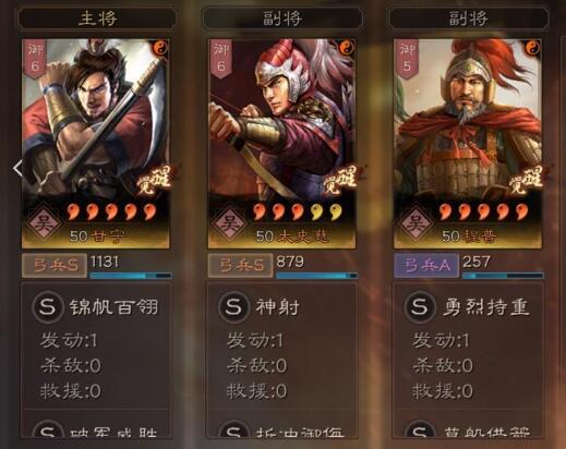 总结:甘太程的配置是很多玩家都会选择的一套玩法,目前有带当锋摧决和弯弓饮羽的玩法,如果带当锋摧决的话,就基本不怕抚辑军民暂避其锋这类战法,甘宁可以保证输出!如果带的是弯弓饮羽的话,那么甘宁也可以选择点破阵,脸好的情况下“弯弓饮羽+破军威胜”基本上单点到一个武将的身上,基本上对面就是0统率的宝宝,根本吃不住甘宁的一发暴击!游戏中可以靠那么少兵力战损2.7W兵力的队伍还是比较少见,只能说甘宁这个武将属于比较看脸的武将,上限触发的确谁都能打,脸黑的情况下也可能出现被诸葛亮算计到阵亡的情况!