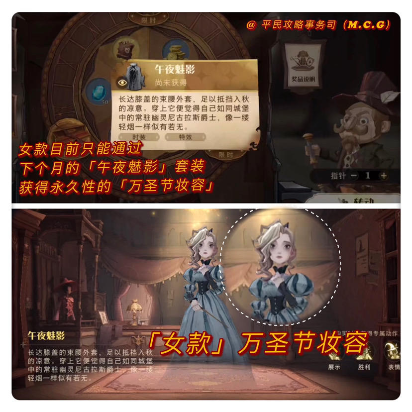 2.下个月的「午夜魅影」套装可以永久解锁「万圣节妆容」,通过改变「头发」获得的妆容并不是永久性的。