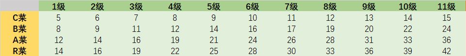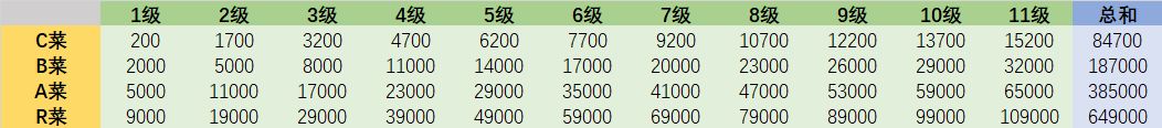 好,接下来我们看一下各级别菜品从解锁到升满级(11级)所需的价格。(数据源于星落)
