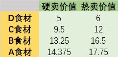 ⚠️即可任意卖出的食材比例为(满食材情况):A:B:C:D=1:0.5:0.75:0.625