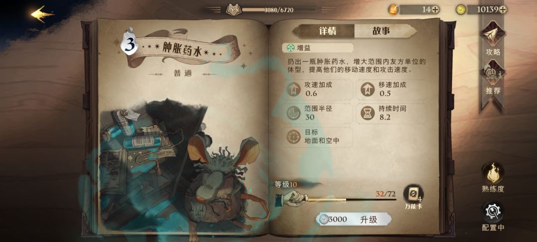 而三书的属性是攻击间隔0.6且拥有迅速冲到对方身前的能力。可三本妖怪书在本身有极高攻速的情况下配合海格回响则是100%+0.55%,咬 一口的速度从0.6变成了0.38而且是三本书,0.38秒可以咬3口,0.38x3x15,配合海格回响后每秒伤害基本翻了一倍。当然这还不够,所以我们要加上肿胀药水