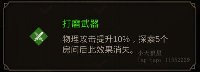 选项选择【强化武器】得到一个物理攻击加10%的buff,5个房间消失。选择【修补护具】护甲恢复20%