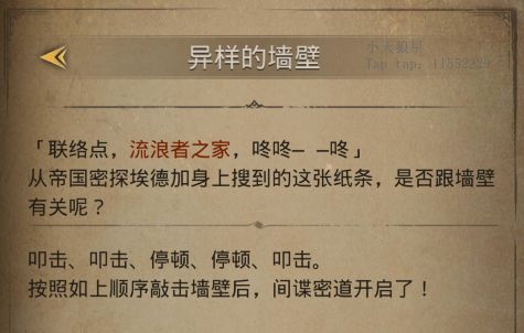 第五:【流浪者之家】的异样墙壁过法是:敲,敲,停,停,敲,开启隐藏地图【间谍密道】