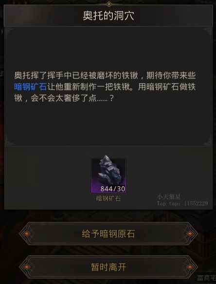 会直接给你他的武器【亚力克之锤】(这也就解释了为什么他后面会死在先祖之墓中)第三:【大型集市街】中杂货商店通过后,激活对话【调查洞穴】得知需要【暗钢矿石】X30(要给。开隐藏地图用的)