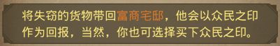 第一:【富商宅邸】罗克曼的商店,有需要就买,【众民之印】可以等后面找回【罗克曼的货物】时会送给你