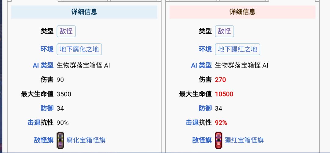 大宝箱怪,就是在神圣与腐化(血腥)地下概率遇到的加强版宝箱怪,面板如下,左边为普通模式,右边为大师模式,三个宝箱怪没有不同(这抗性真的有必要么)