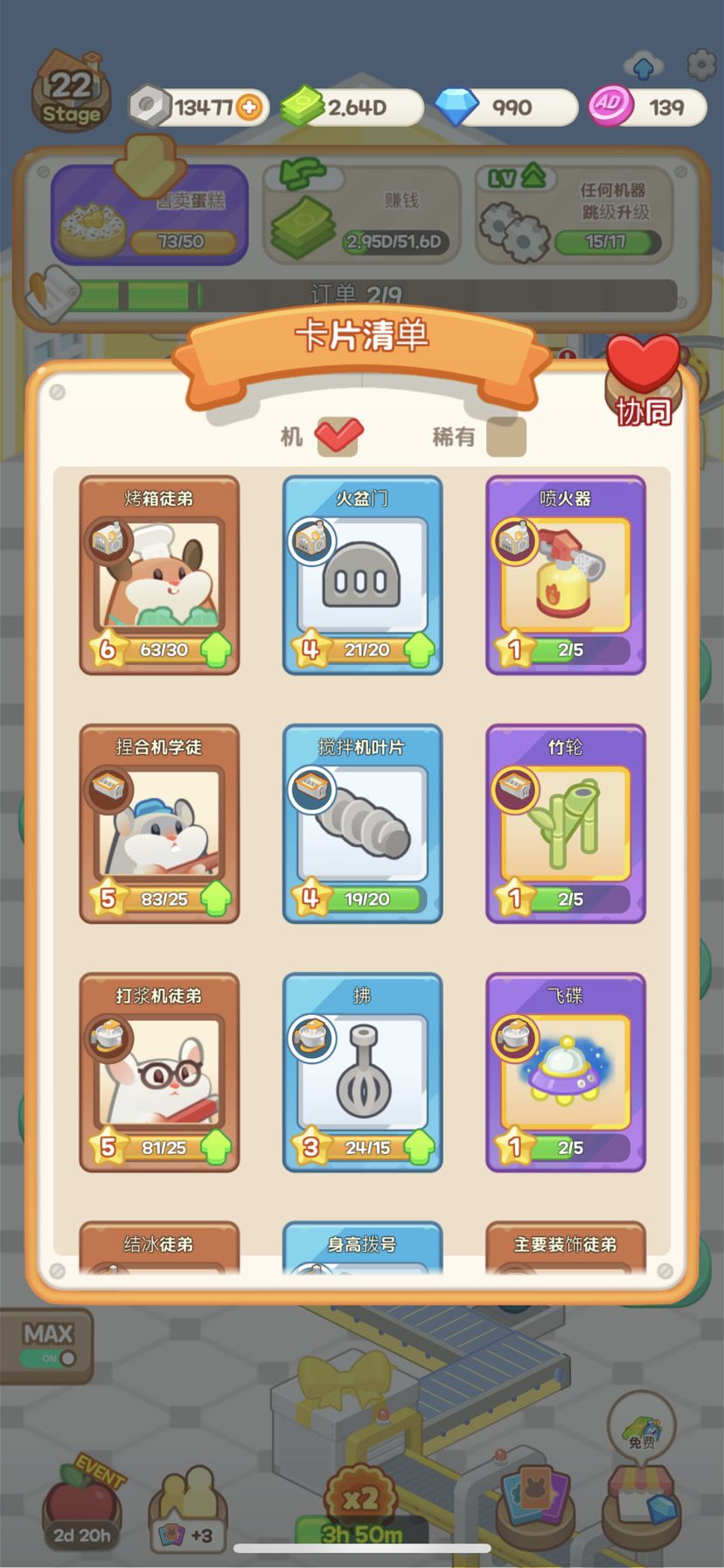 整体的界面是这样,玩法很简单,一个造型的蛋糕对应一家蛋糕工厂,也对应一个关卡。介绍:每个关卡都有不同的做蛋糕的机器,比如烤箱 搅拌机。每台机器对应不同的仓鼠。