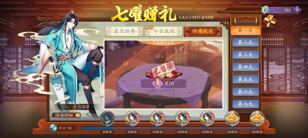5.七曜赠礼,就是七天开服任务,分为成长任务和今日挑战,只要不养错灵异,把礼包养满就可以把今天的成长任务做完,还可以拿到48积分的60个碎片升星。记得一定要留点瑰玉买体力,体力是最缺的。