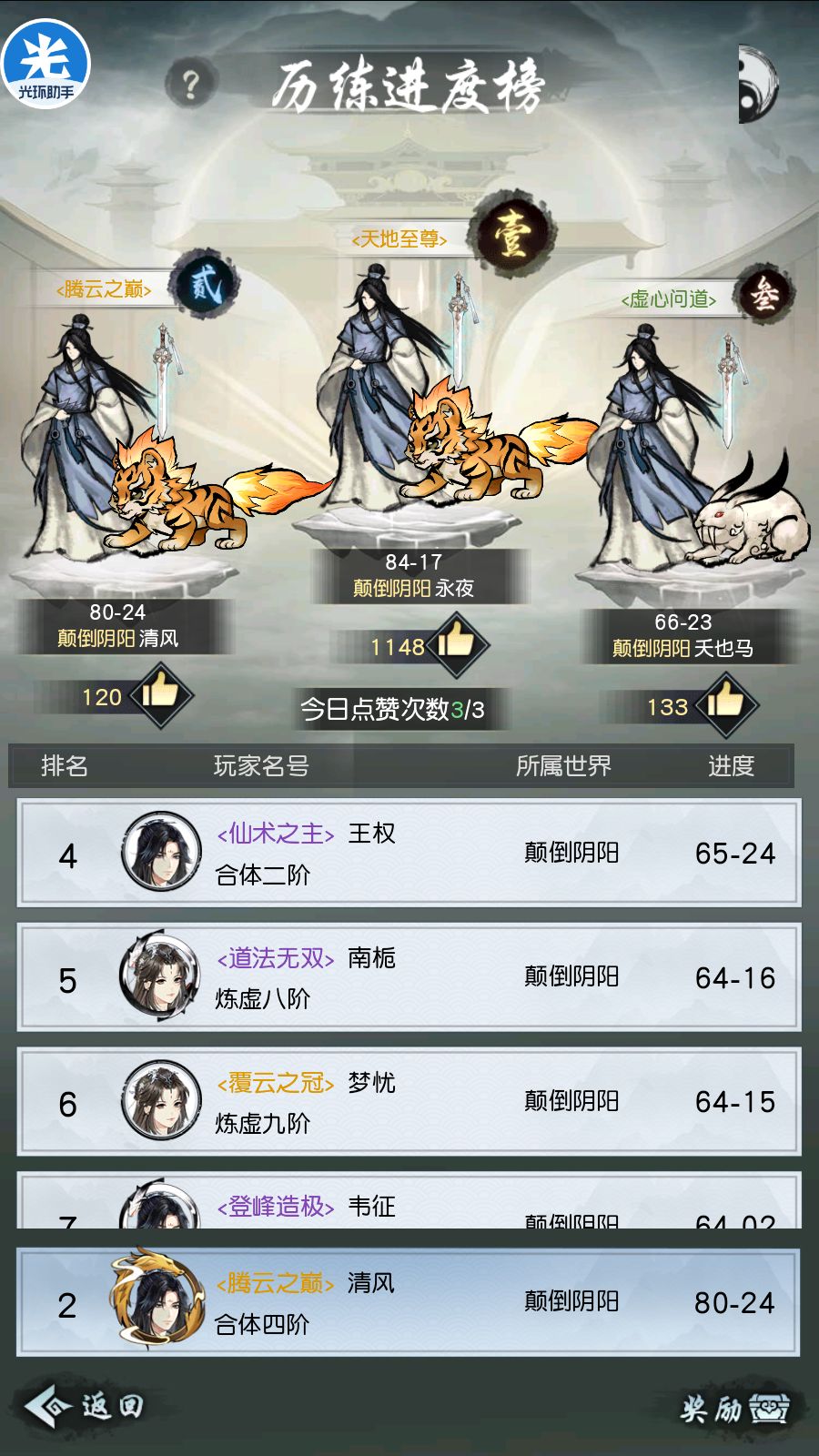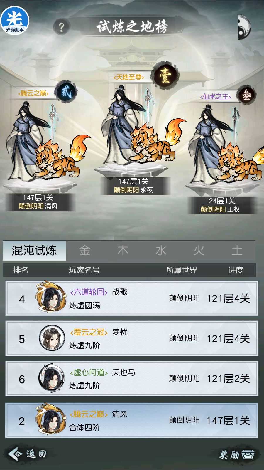 关于闯关,在遇到一些过不去的关卡时,土系的减伤加防类仙术,木系的甘霖,以及所有诸如定身冰冻等控制类仙术,去好好看它们的作用以及boss的技能,巧妙搭配是可以突破极限的。往往策略对了你还得去赌这个控制能不能连续给到,boss的飞剑会不会连续暴击,只有两个条件都满足时才能顺利通关,这样一关可能得重复打几十次才可能成功一次。那会刚玩第一周只充了个终身卡,历练冲榜最后几乎都是到了这种极限,试各种方法,硬是把那个充了上千的大佬顶下去拿到了金色宠物。