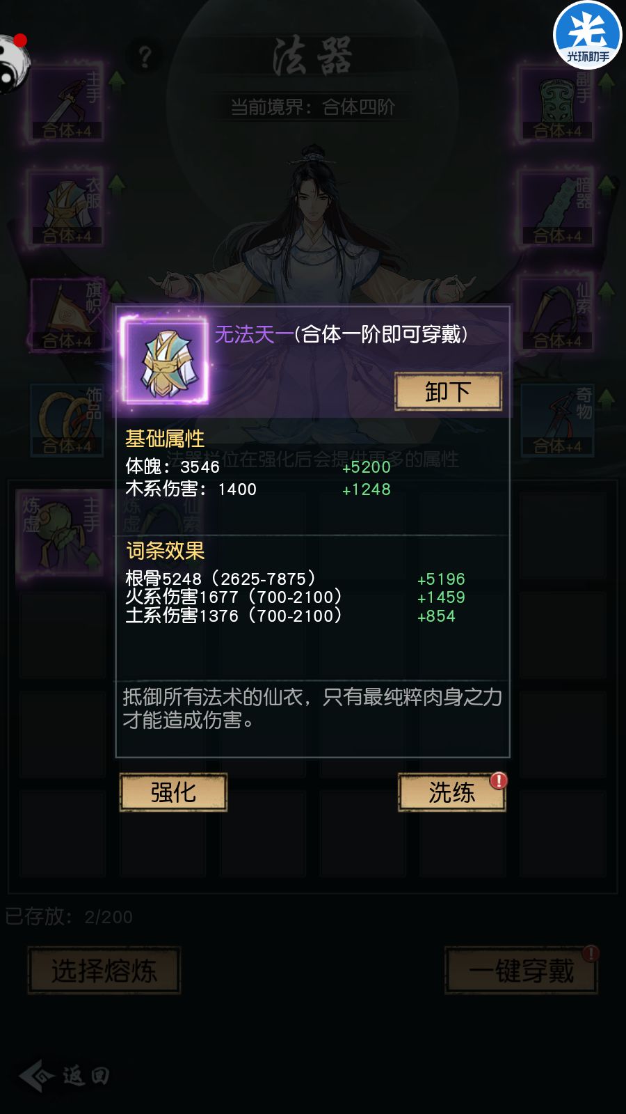 最重要的是你的面板属性,根骨和对应的五行属性。体魄没那么重要,该被秒还是被秒。除了吃药,装备提升巨大。装备一定不要相信系统的选择,因为这游戏装备上的宠物词条虚战占比非常大,系统会优先选择这些装备,实际上非常拉胯。所以要手动去选择装备,包括蓝色级的,属性优于战力。刷出了带有根骨和你主修的属性伤害词条的装备时是必选的,比如这件同时带有根骨和火属性的,直接起飞。