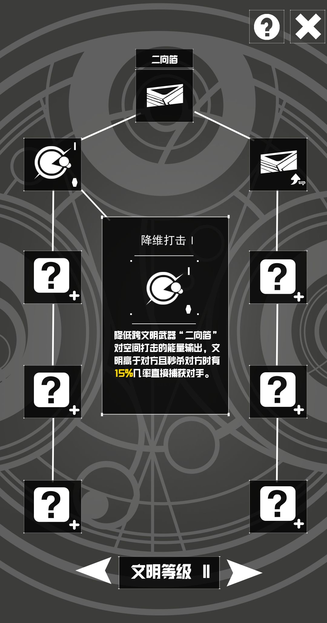 二向箔辅助技能①【降维打击】战斗系,文明高于对方且秒杀对方时有x%几率直接捕获对手。