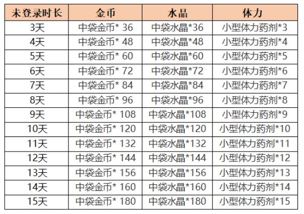 【礼包内容】:奖励会根据未登录的天数进行递增(奖励不叠加),登入游戏即可领取
