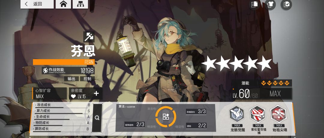 芬恩拥有全角色(截止目前41个角色)排名第二的算力成长,五星六十级的基础算力达到了600点之多。