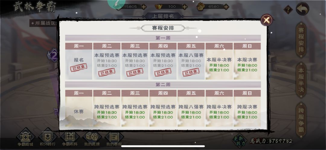 (5)比武大会&比武擂台:擂台没啥好说的了,一般来说一个新区大概会有4-5个充200及以上的,一开始想在擂台打过人是不可能的了,建议不要争第一个赛季奖励,其实也没多少,不值得花银票和别人卡点抢,确保七日之路的7天50场胜利达成就行(每天买3场就好)可以结合武林大会的任务适当加一点点次数。比武大会建议结算当然调一个凌晨4点55的闹钟起来偷一下,毕竟这个活动只有一次,奖励也很丰厚。能搞个比较前的排名还是很赚的。