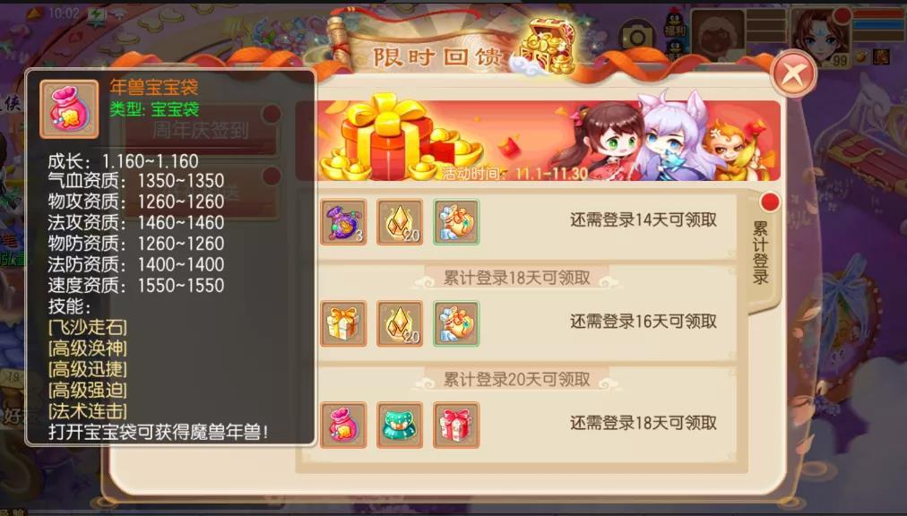 五周年之际,只要在对应的时间内登录,即可免费领取对应的奖励,整个活动持续1个月,在活动期间内登录游戏不仅可以领满所有奖励,还可以在最后一天领取到【年兽宝宝袋】,打开可获得魔兽年兽!
