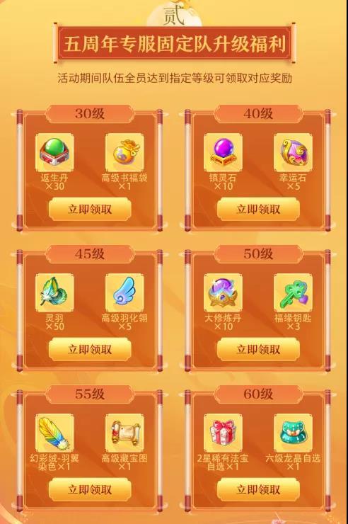成功组建为固定队的队伍,全员在活动时间内达到30/40/45/50/55和60级的指定等级,都能领取一份相应的升级福利。必须全员等级达到指定等级才能领取哦。