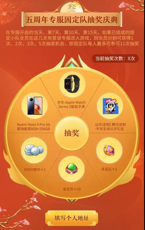 五周年专服开放后,成功组建为固定队的队伍,全员在包括专服开启当日、开服第7日、开服第10日和开服第15日登录游戏,即可分别领取到1次、2次、3次和5次抽奖机会。