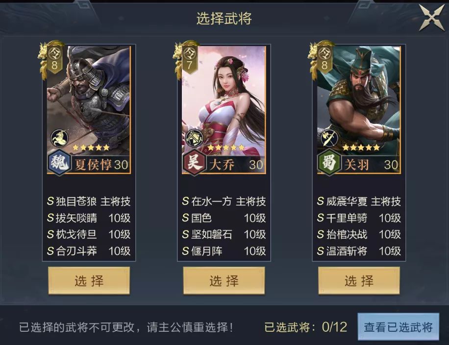 1、在过关斩将玩法中,系统会随机提供36名武将(3名一组)作为预选,主公可从其中选择12名武将参与作战,一旦选取后无法更换,只能随机后重新选择并重新闯关,在参考武将品质的同时需要技能配置,某些相同武将是不同的技能路线。