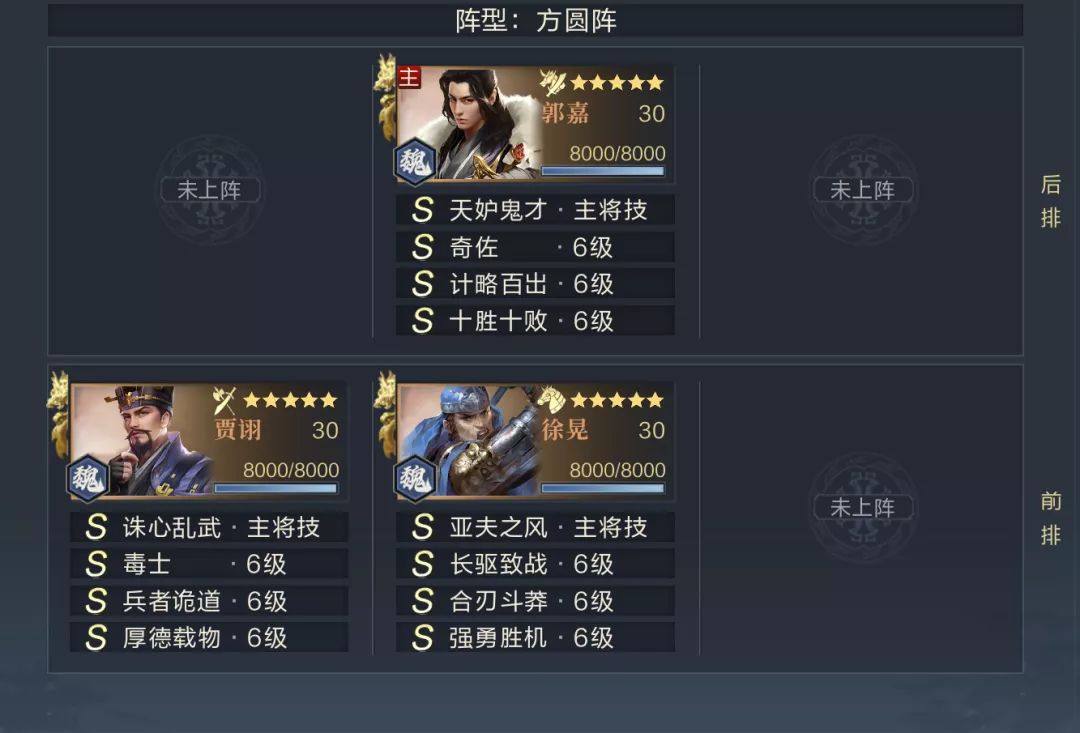第二章的闯关核心与第一章刚好相反,于吉、郭嘉配合贾诩等配置非常克制主动队伍的发挥,所以第二天队伍搭配偏向连击即可。