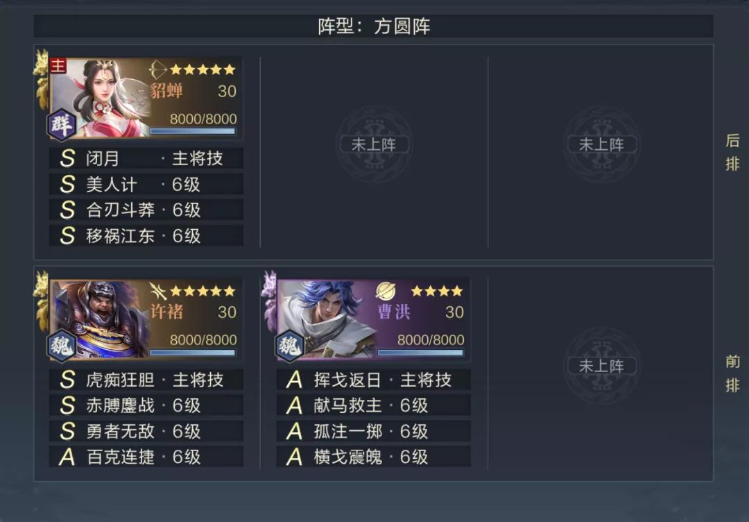 第二关加入了输出较高的许褚,但队伍整体的承伤能力非常低,同样可以使用纯武力队伍通过,推荐124站位,保证输出能够快速爆头貂蝉即可。