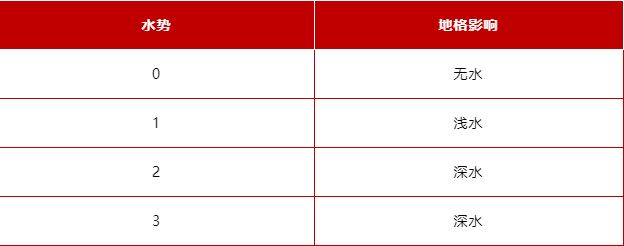 水势是指当前地格中的蓄水情况,可以由积雨值与地势相减获得,并且根据水势大小分为无水、浅水和深水三种情况。