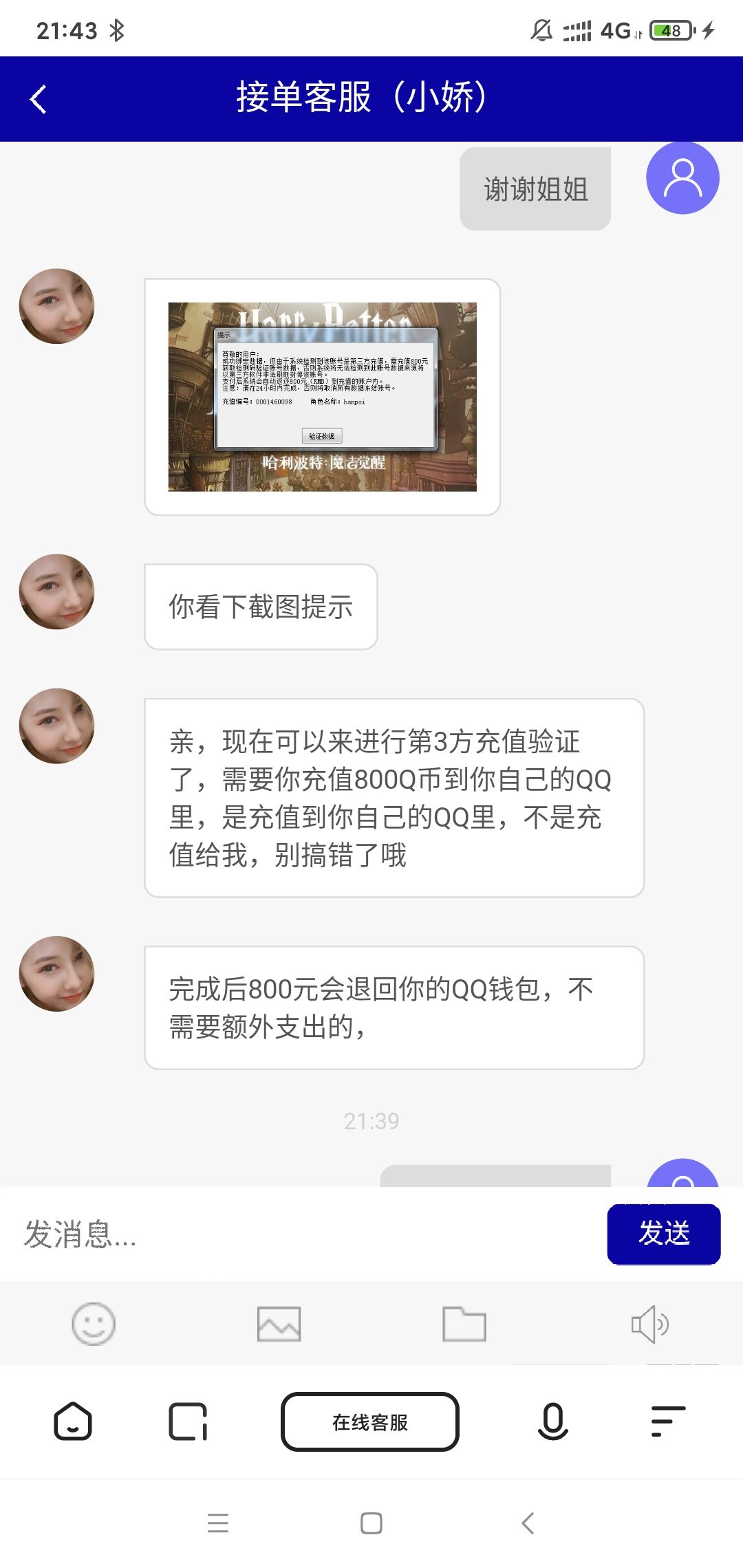 一开始他们在游戏里发群我加了,可以低价买宝石,客服说要微信扫码给他五十元才能下单,后面又说要800元才能过掉封号检查,最后说1500元大功告成…然后昨晚十点左右登我qq要各种验证码把我800q币全花光…😂