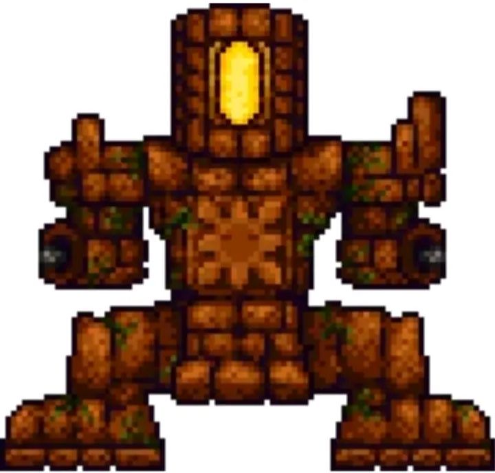 召唤方式:世纪之花被击败后,且物品栏里有丛林蜥蜴电池的情况下,于丛林神庙最里面的房间找到丛林蜥蜴祭坛,用电池激活祭坛即可召唤石巨人